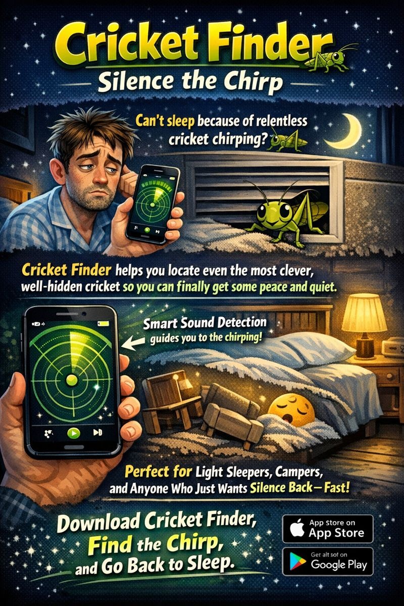 At Cricket Finder, we understand how disruptive a single chirping cricket can be to your peace of mind. Our innovative app harnesses advanced sound detection technology to help you pinpoint the source of those pesky chirps that keep you awake at night. Designed for restless souls, campers, and anyone seeking a quiet sanctuary, we aim to restore your tranquility with ease. With our user-friendly interface, you'll say goodbye to frustrating nights of guessing and searching. Download Cricket Finder today and reclaim your sleep!